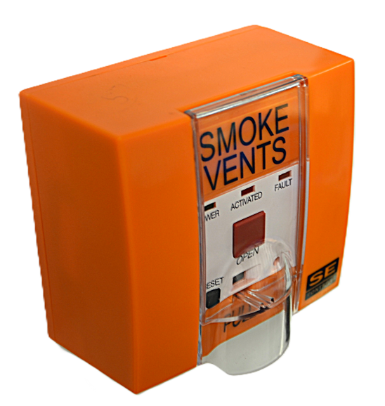 The orange (RAL 2011) MCP displays system and vent status visibly through three LEDs, “power, fault and activated” as required by the standard.