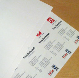 Business Cards on demand. That is one of the many benefits of the Business Cards from Sentega Labels. We produce blank Business Cards so you can make your own cards on an A4 sheet with pre-punched cards. These can be printed on demand on your own mono or colour laser printer so no more problems with distributing a large quantity of cards. You decide how many you print yourself. The cards come cleanly off the carrier paper because of the application of a special Dry-Peel adhesive.