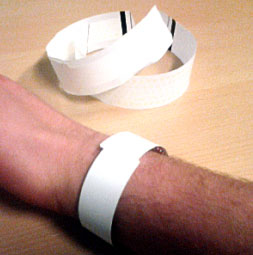 The Wristband, a band that can be processed by using a thermal transfer printer or a laser printer with patient information. The Wristband can also be used for festivals etc. as a ticket. The band is shower resistant and anti-allergic and is also equipped with security slits to prevent removal and re-application. It has the additional benefit of being soft enough to be gentle on the skin.