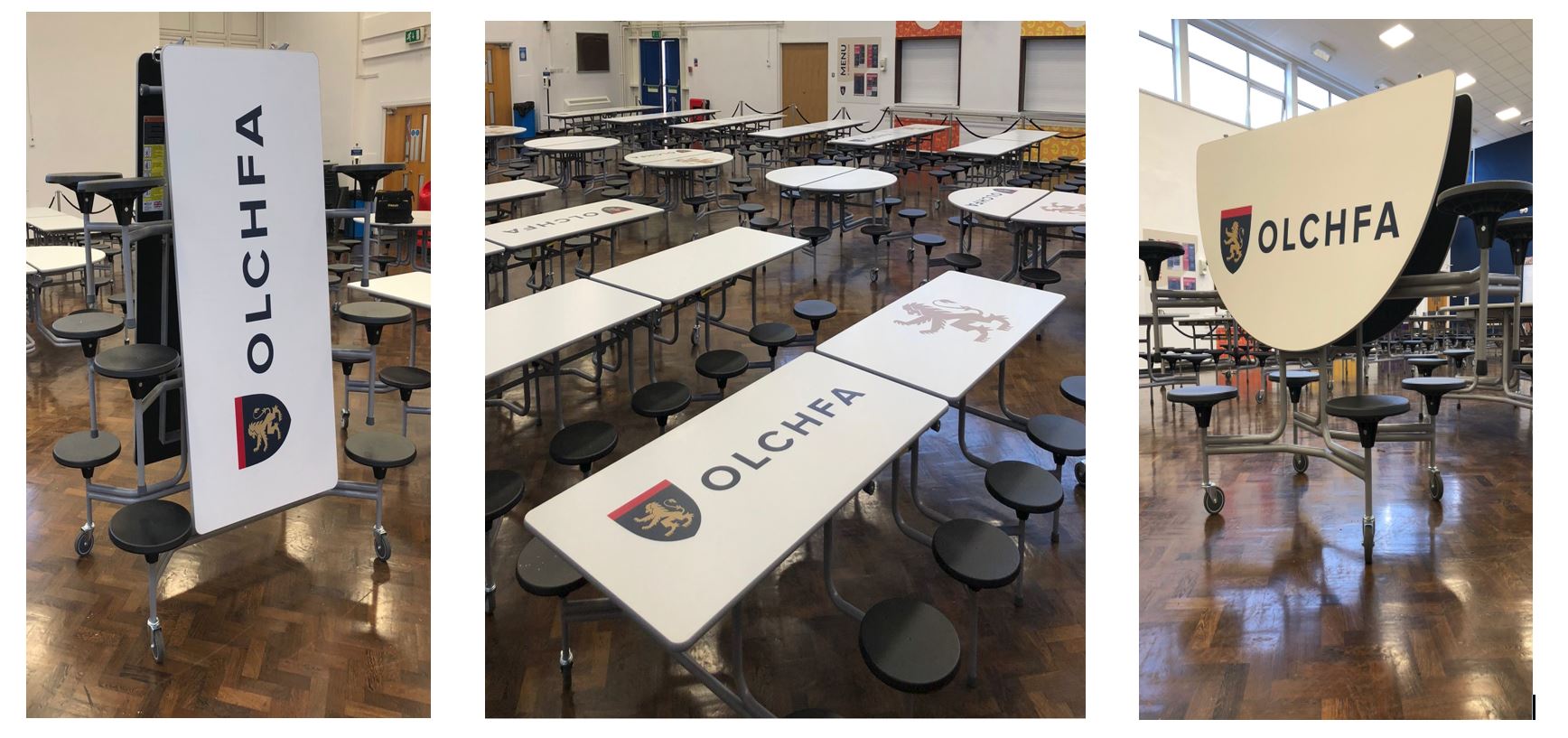 Olchfa School in Swansea used their school insignia on their new tables. With over 1700 pupils, to maximise space and storage they choose the best selling 12 seat Table Seating unit and the 8 seat Graduate table Unit.
