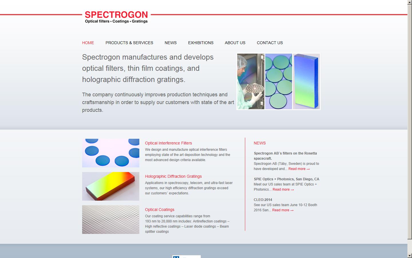 Spectrogon manufactures and develops optical filters, thin film coatings, and holographic diffraction gratings.