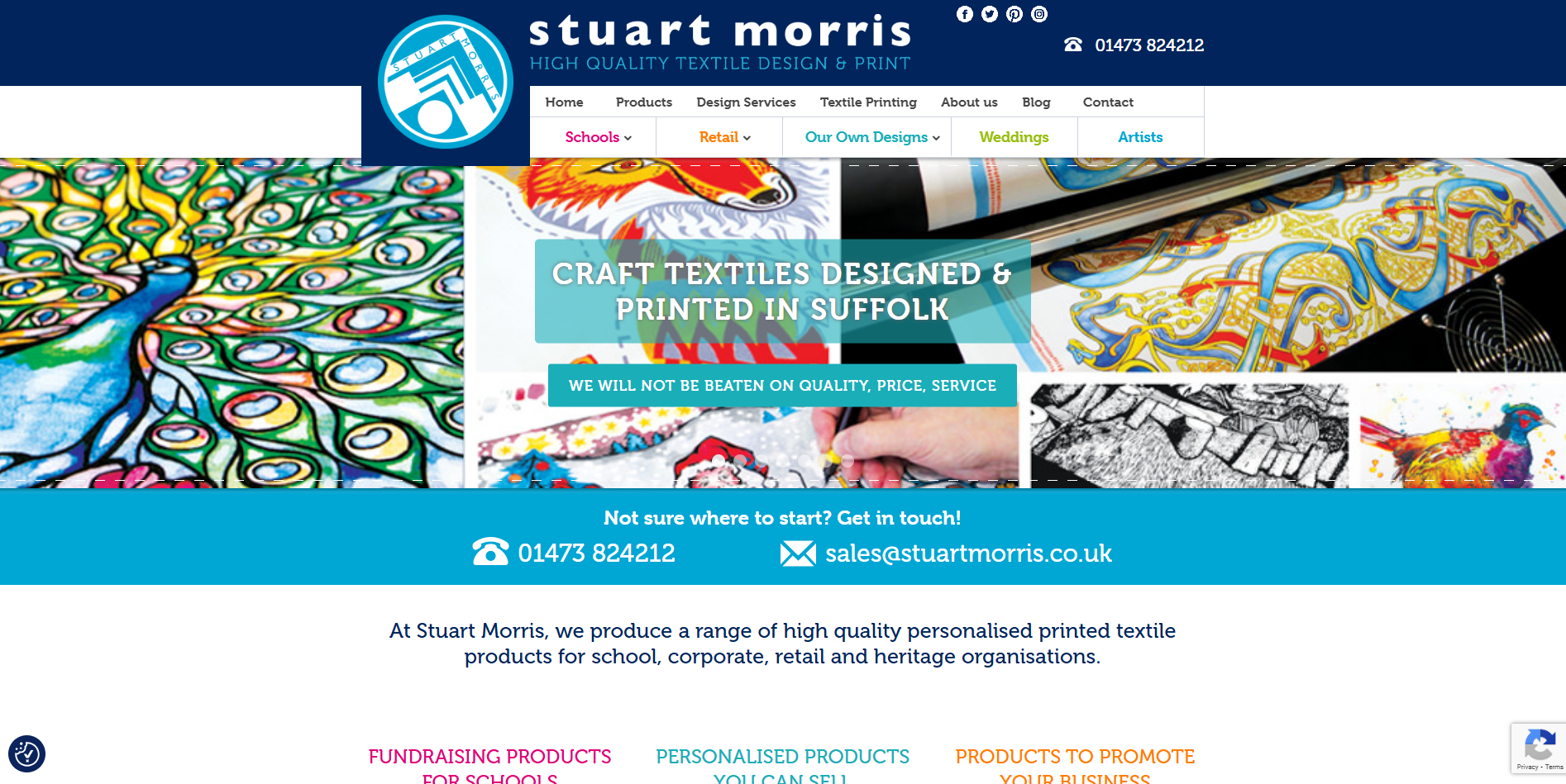 Stuart Morris was first established in 1980. Since then we have used our expertise in textile design and printing to supply textile products to schools and businesses throughout the UK and overseas. We have earned the reputation of being one of the UK’s leading craft textile printers and suppliers. Stuart studied Art and Design at Leeds and Leicester and having gained his master’s degree in Printed Textile Design, he took a position as lecturer in Design and Screen Print. As well as pursuing his passion for creating his own contemporary artwork which he exhibits internationally, Stuart followed in the footsteps of his father (who originated and directed the renowned Blendworth Collection) and set up his own textile, design and print company.