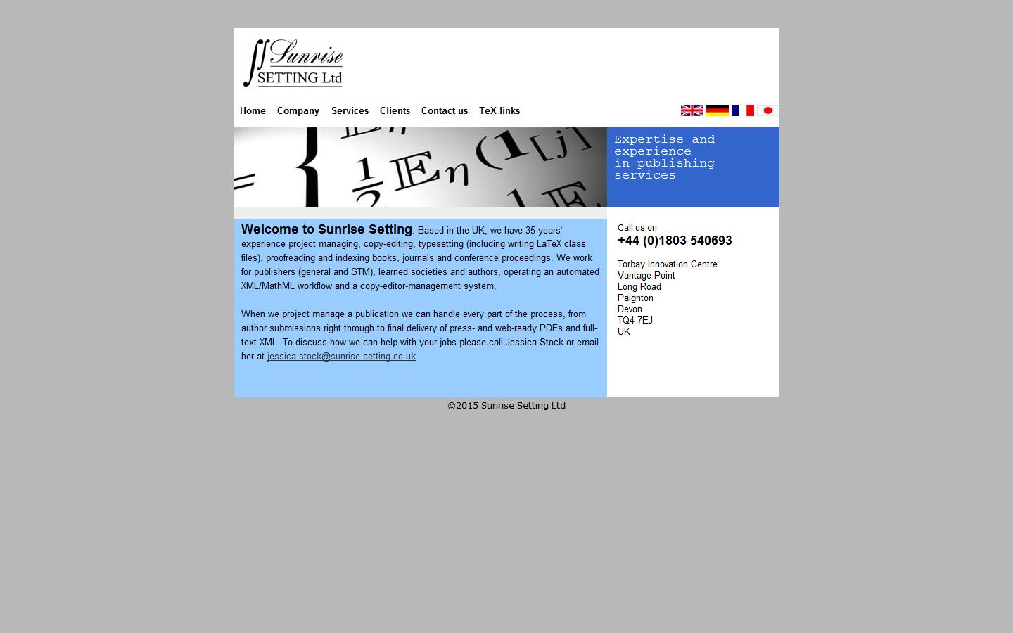 Sunrise Setting Ltd are a UK based company specialise in Project Management, Copy-editing, Typesetting/compostition, XML workflow and LaTex and author support for publishers, learned societies and authors. Operating an automated XML/MathML workflow and a copy-editor-management system.