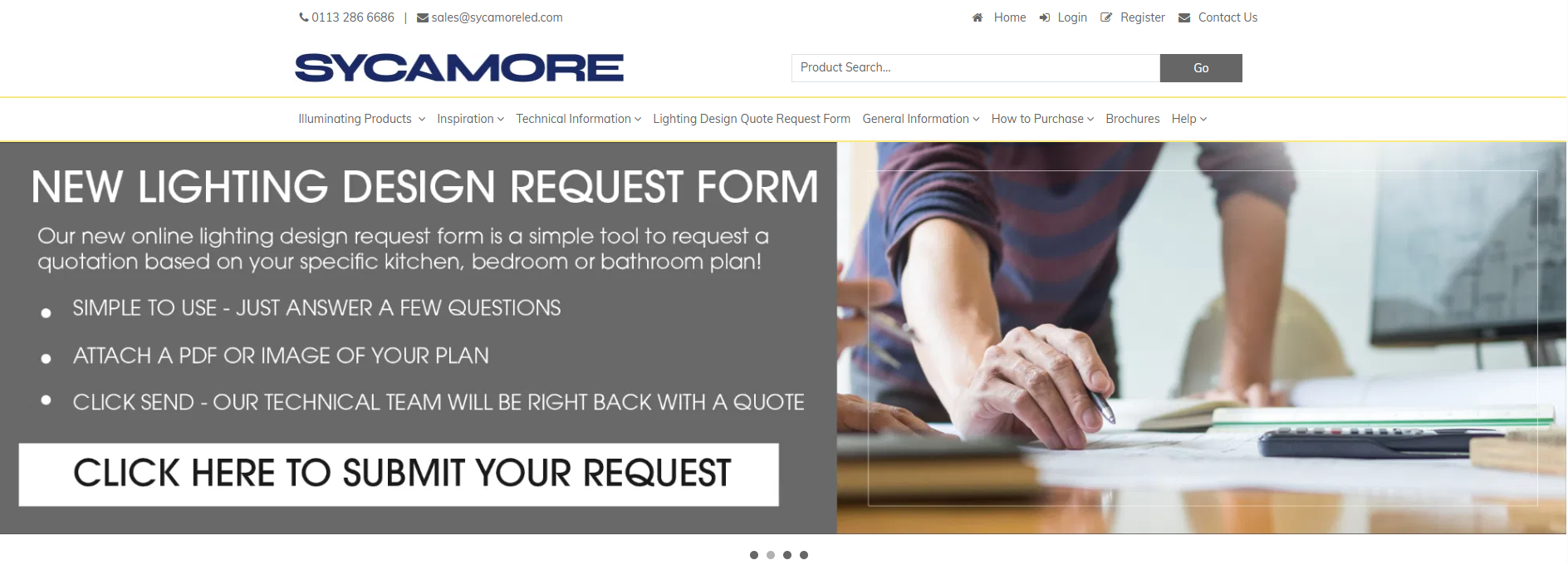 Sycamore lighting products include LED cabinet lighting, mains voltage cabinet lighting, LED over cabinet lighting, LED plinth lighting, LED drawer lighting, LED strip lighting, illuminated shelving, LED illuminated splashbacks, bedroom lighting, illuminated mirrors, bathroom wall lighting, COB LED Downlights, fire rated downlights, shower lighting, fixed & tilt downlights, IP44 spotlights, power ports, lamps, dimmers, sensors & switches, LED drivers and wireless controls.