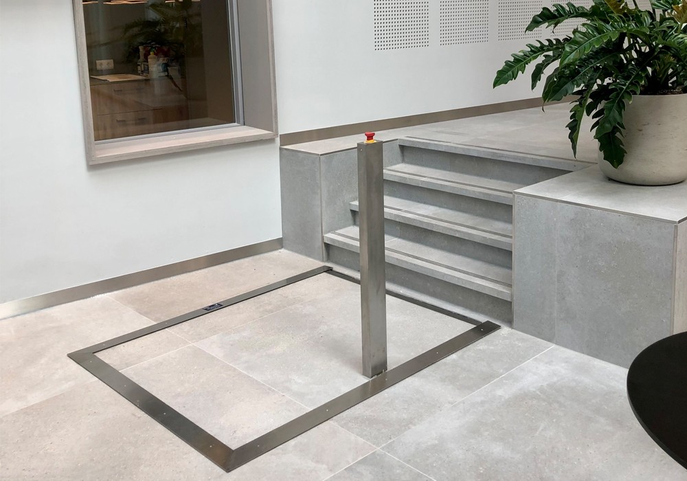 HDN is a simple yet practical hidden wheelchair access lift solution to overcome a slight difference in level (0-500 mm) such as a step. It is built into the floor, so the mechanism is completely concealed. The lifting platform remains flush with the existing flooring when not in use, making it ideal for entrance areas.