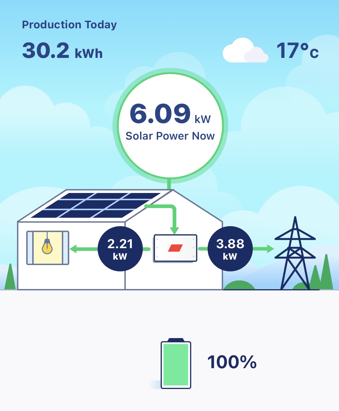 • Production Today: 30.2 kWh (total solar energy generated today).