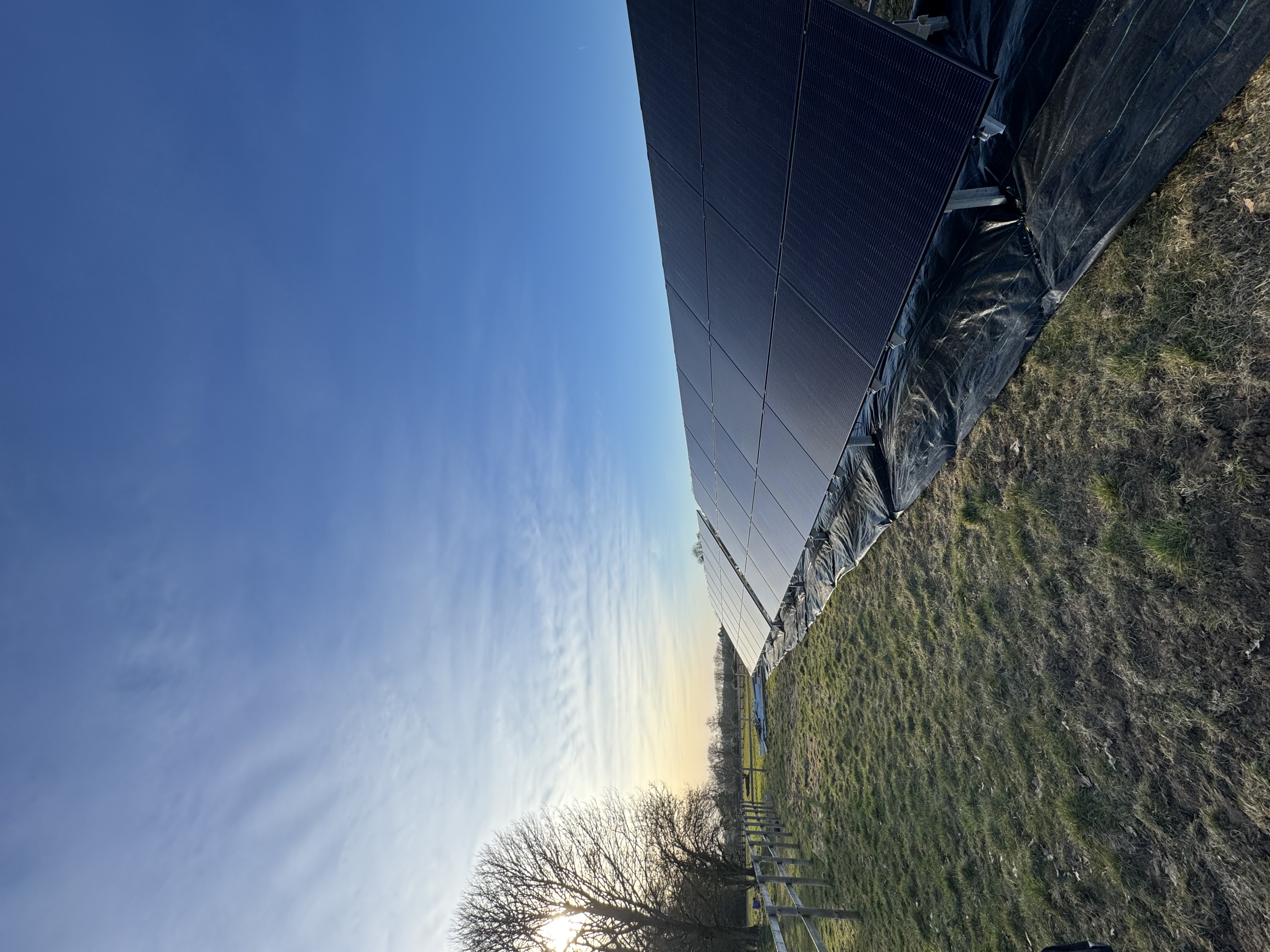 Set within open countryside, the system is designed to maximize efficiency, with rows of high-performance solar panels angled to capture optimal sunlight throughout the day. The installation uses durable ground-mounting structures and protective ground covering to ensure long-term stability and minimal maintenance.