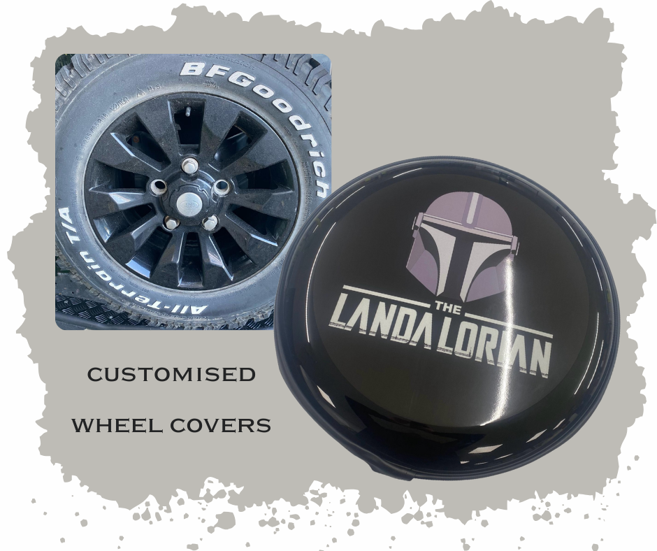Personalised 4×4 spare wheel cover printed with your graphics, photo or advertising and wheel cover stickers for you to apply to your existing rigid or semi rigid wheel cover.