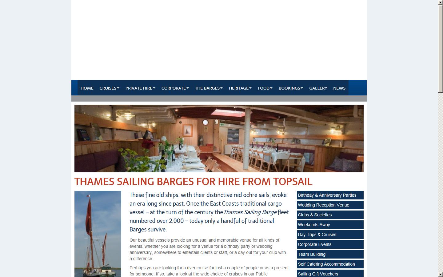 Topsail Charters have a range of stunning, unique Thames sailing barges available for hire for various events such as weddings, parties, corporate events, clubs and societies, etc, as well as offering various cruising experiences including river cruises, day cruises, weekend cruises, barge races, etc.