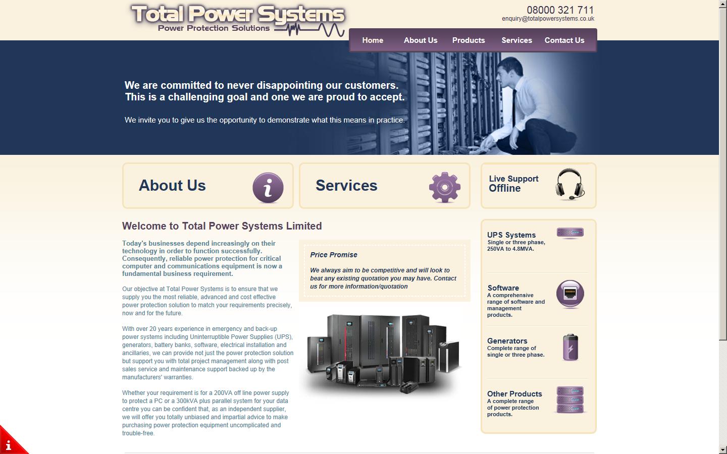 Total Power Systems Ltd has over 20 years experience in emergency and back-up power systems including Uninterruptible Power Supplies (UPS), generators, battery banks, software, electrical installation and ancillaries.