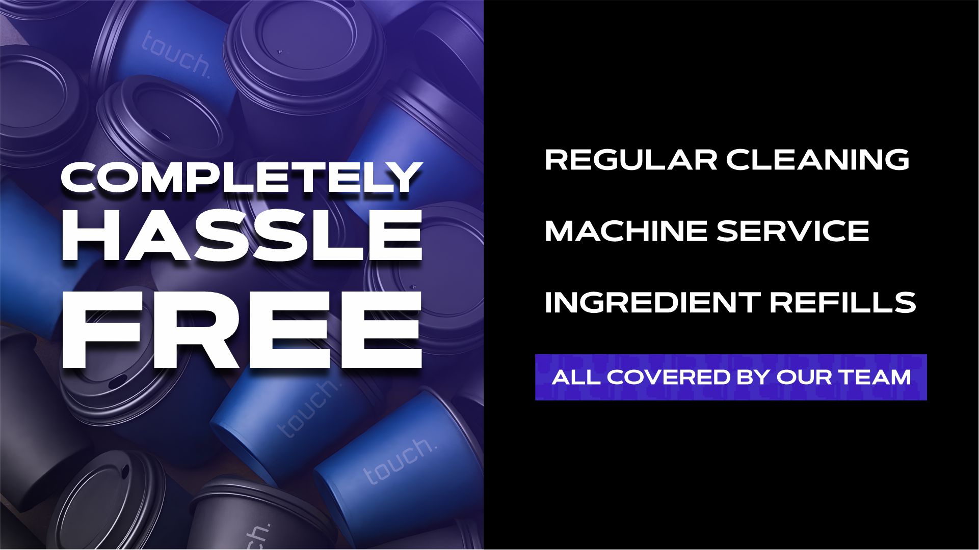 We take complete responsibility for the operation of the machine. Regular cleaning, ingredient refills, preventative maintenance and technical support are all carried out by our team. This means you and your staff never need to worry about downtime, hygiene, or product quality – it’s all taken care of.
