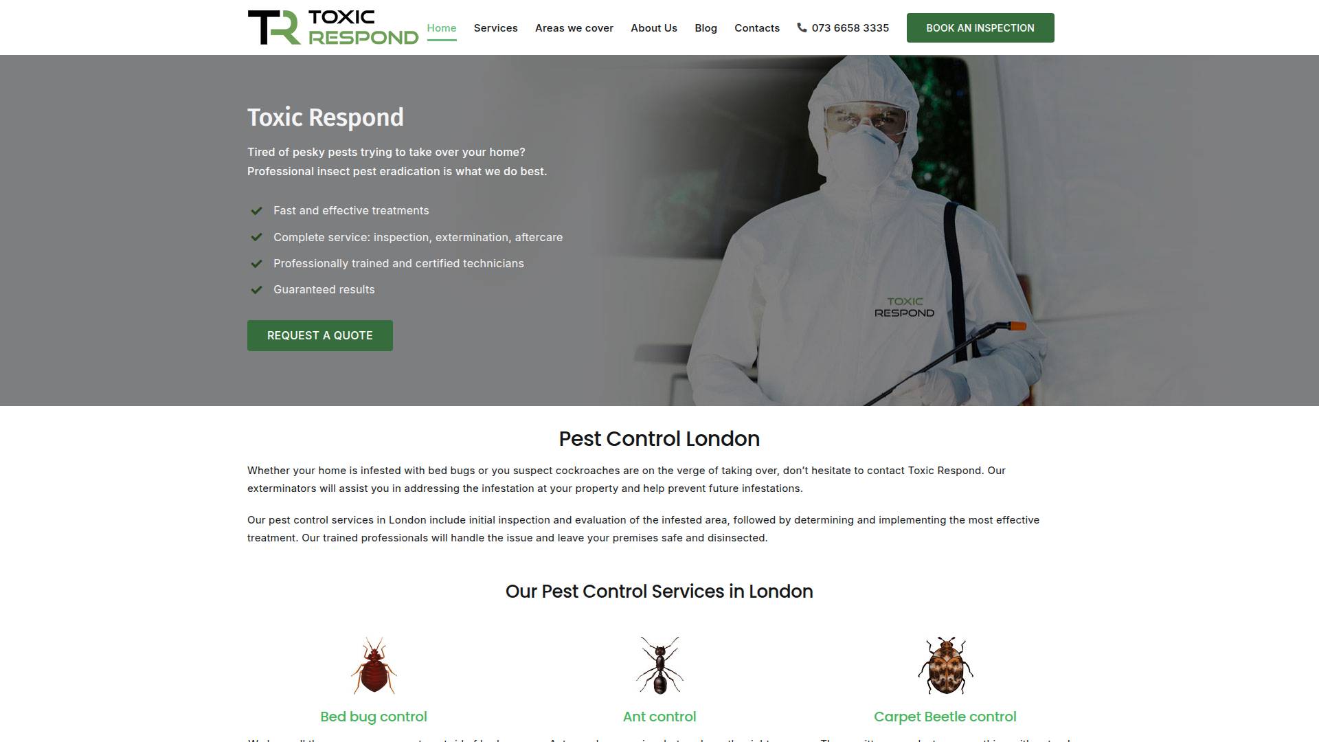 Toxic Respond is a London-based pest control company delivering discreet, effective solutions for residential clients. With expertise in managing insect infestations and a wide range of household pests, the company prioritizes safety, reliability, and responsible treatment methods.