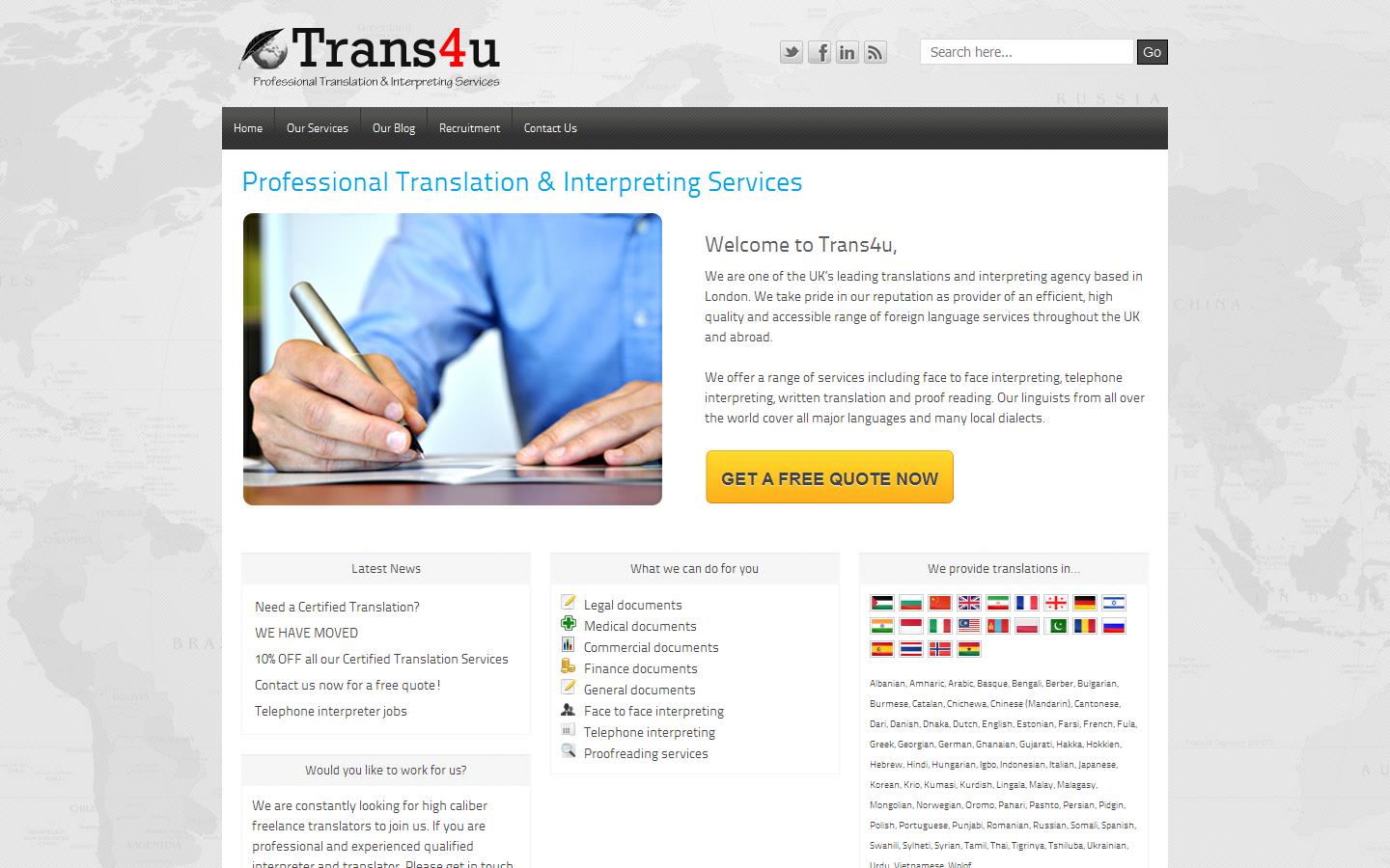 Trans4u Ltd Translation & Interpreting Services provides translation, interpreting, transcription and localization services throughout the United Kingdom and worldwide. We offering wide range of services including Face to Face Interpreting, Telephone Interpreting, Written Translations, Transcriptions and Proof Reading.