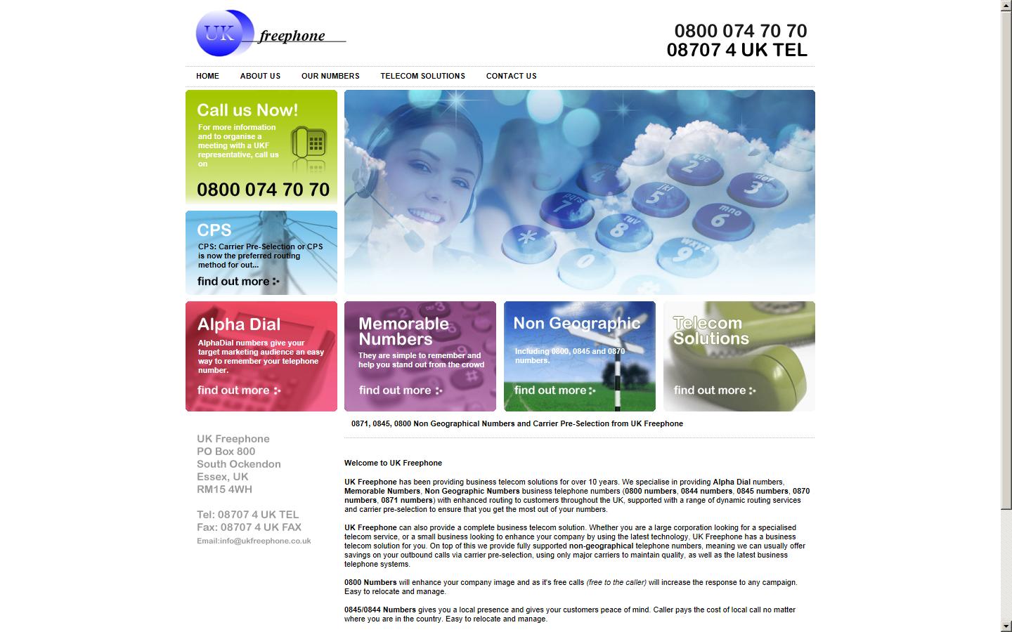 UK Freephone has been providing business telecom solutions for over 10 years. We specialise in providing Alpha Dial numbers, Memorable Numbers, Non Geographic Numbers business telephone numbers (0800 numbers, 0844 numbers, 0845 numbers, 0870 numbers, 0871 numbers) with enhanced routing to customers throughout the UK, supported with a range of dynamic routing services and carrier pre-selection to ensure that you get the most out of your numbers.