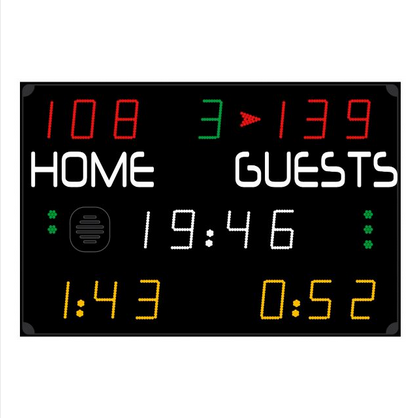 Scoreboard face manufactured from shatterproof mat polycarbonate, wall mounted. High quality LED display (4 colours: red, green, yellow, white), using 240v mains supply, board comes complete with mains cable. Scores up to 199.
