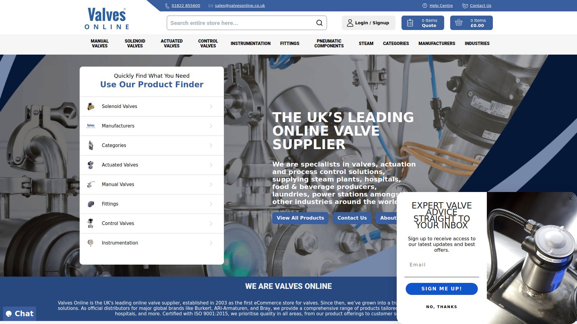 Valves Online are the UK's leading online valve specalist suppliers of valves, actuated valves, actuators, fittings, ball valves, butterfly valves, hygienic valves, HVAC, knife gate valves, globe valves, diaphragm valves, pressure relief valves, ATEX approved valves, WRAS approved valves, etc. We have one of the largest ranges of valves available to order online for all industry applications.