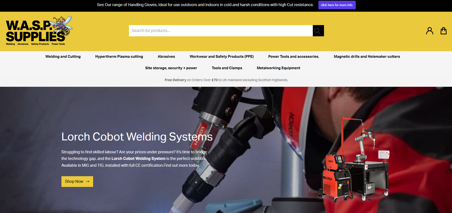 Wasp Supplies Ltd are based in the UK and are specialist global supplier of high quality equipment and consumables designed for the welding and metal fabrication industry, These include all types of Welding machines, welding consumables, Cobot welding systems, Handheld Laser welding machines and plasma cutting equipment along with the associated Safety products to protect from Hazards found in a metal fabrication shop, Abrasive grinding, cutting and finishing products that range from heavy weld removal through to fine polishing and the specialist power tools used to complete the process's.