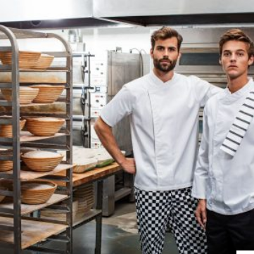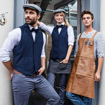 We provide workwear for restaurant kitchens, bar and waiting staff, and front-of-house teams. Our extensive range of promotional hospitality clothing can be custom-branded and includes chef and sous-chef garments (long and short sleeve), scarves, tea towels, hats, check trousers, and a variety of adjustable aprons in multiple styles and colours.