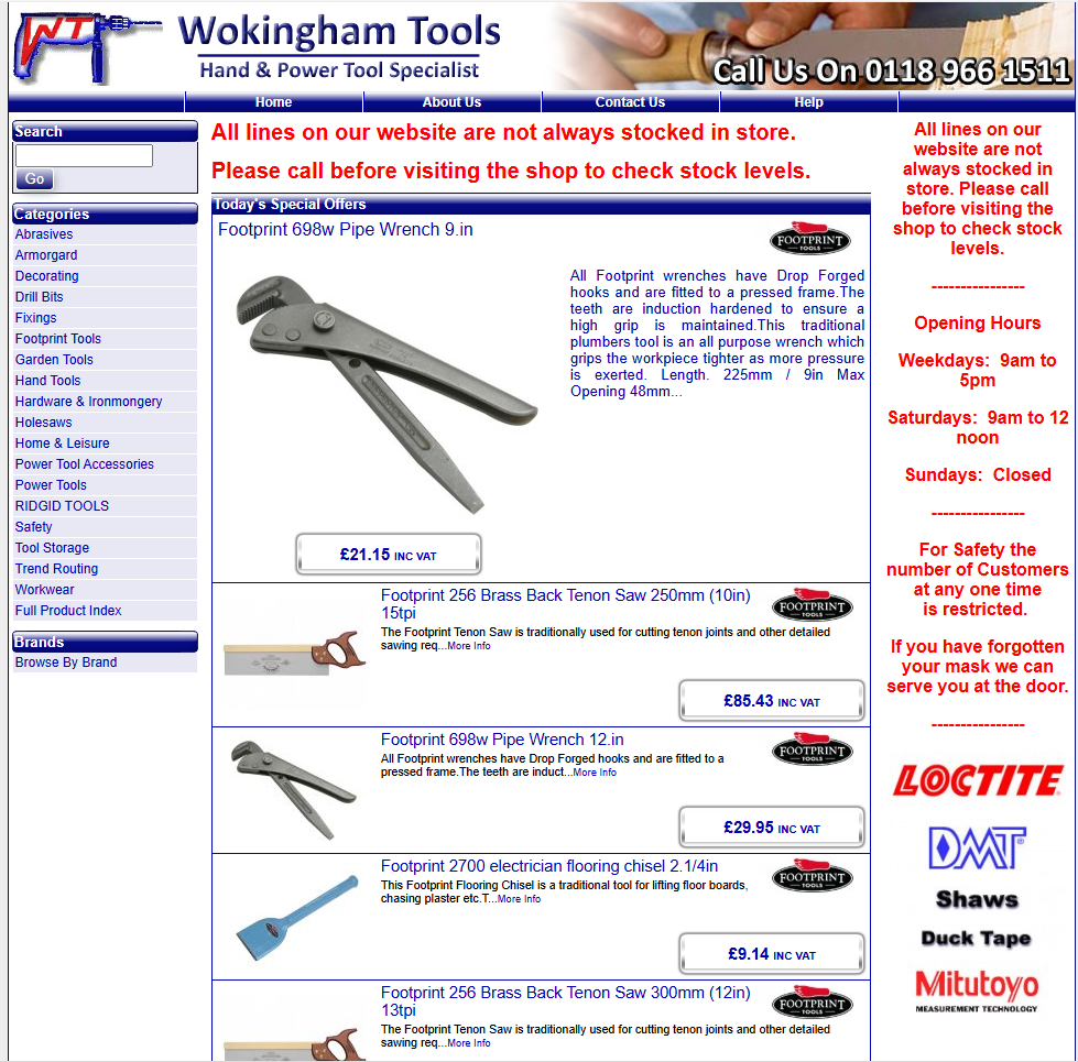 Wokingham Tools is a family run business owned by Keith and Elaine Gibling. Wokingham Tools has been trading since 1975. We started life as an office in Wokingham just outside Reading in Berkshire selling a small amount of hand and power tools direct to the trade. After a year it was very obvious Wokingham Tools needed bigger premises so we acquired a shop just outside Reading town centre where we are today. Wokingham Tools has had to keep on expanding building a bigger and better name for ourselves with a reputation for quality and service to match. As before Wokingham Tools kept on getting bigger and better so we bought the shop next door, with a few extensions here and there we are now expanding onto the internet.