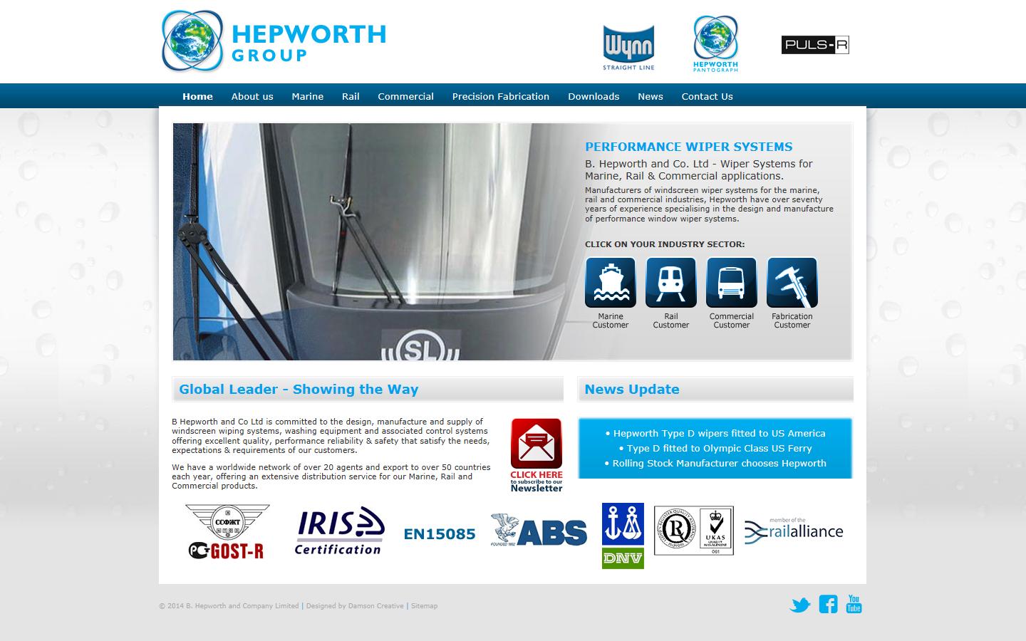 Hepworth Group is committed to the design, manufacture and supply of windscreen wiping systems, washing equipment and associated control systems offering excellent quality, performance reliability & safety. With a worldwide network of over 20 agents, we export to over 50 countries each year, offering an extensive distribution service for our Marine, Rail and Automotive products.